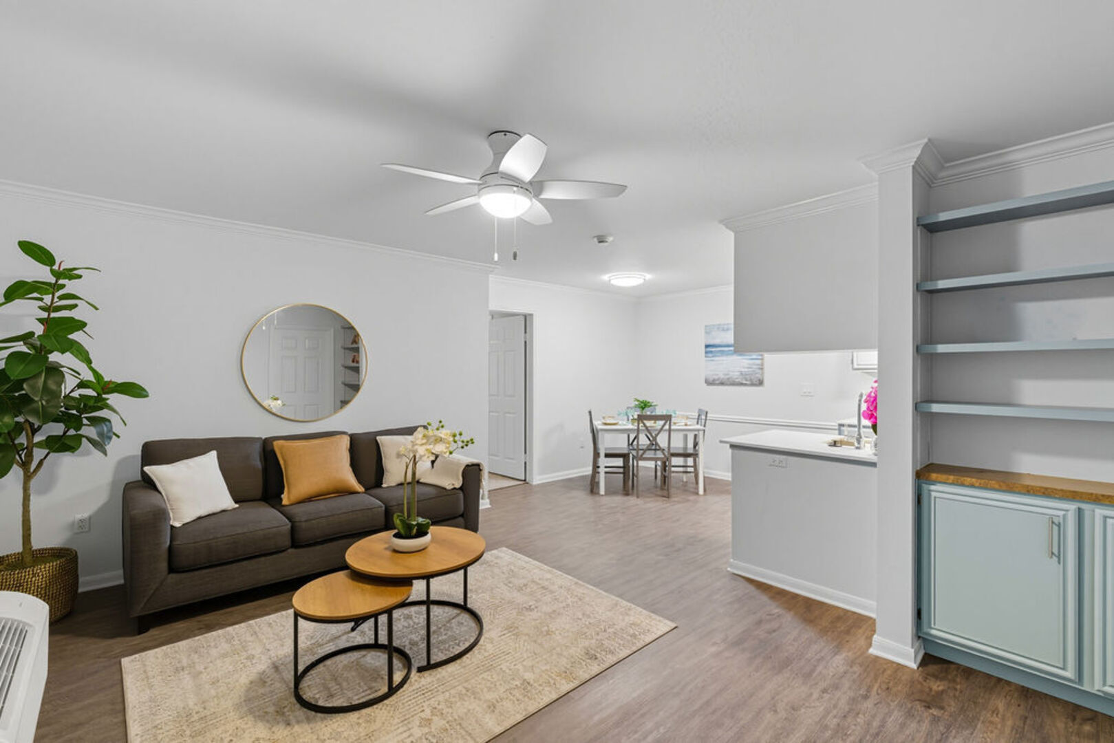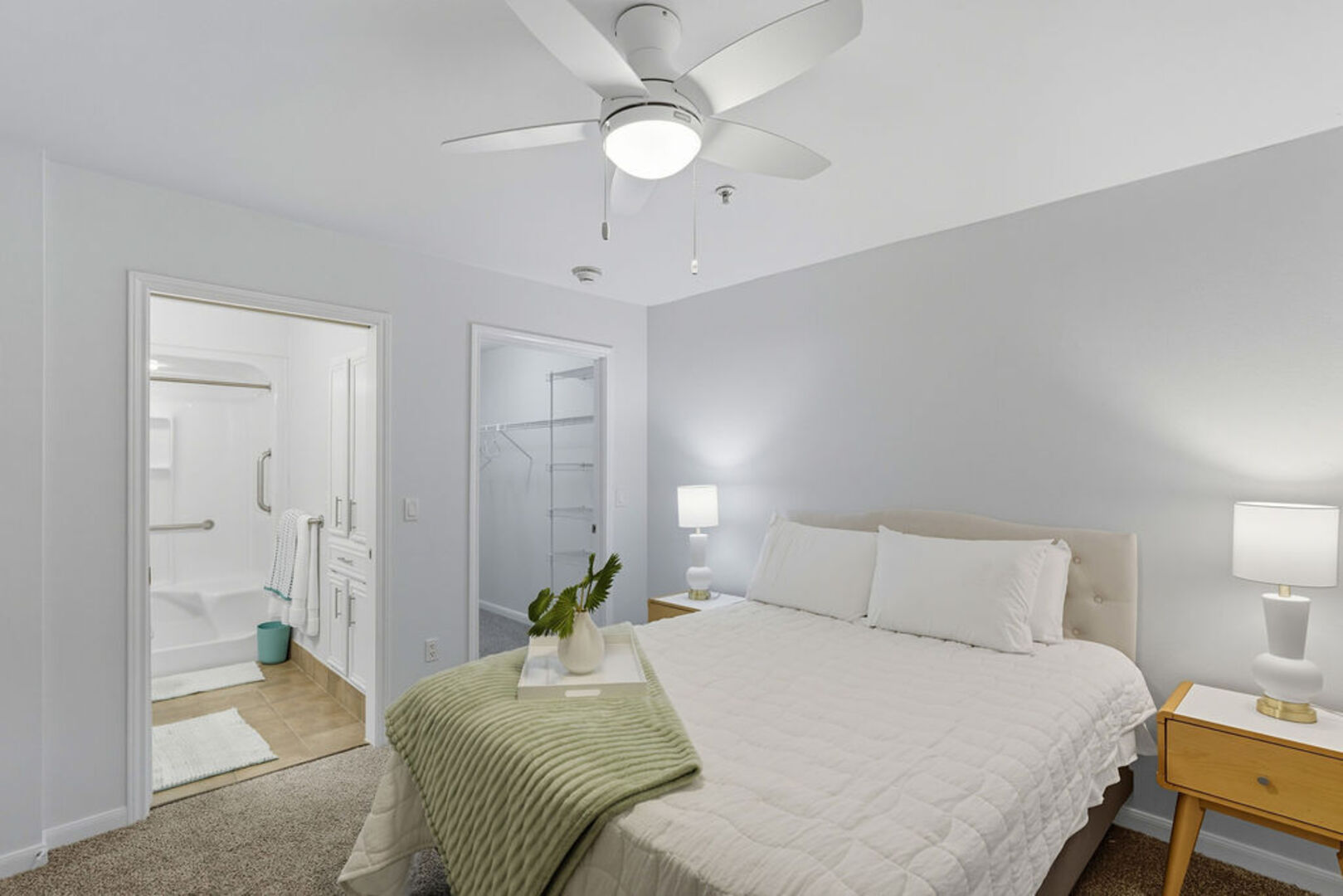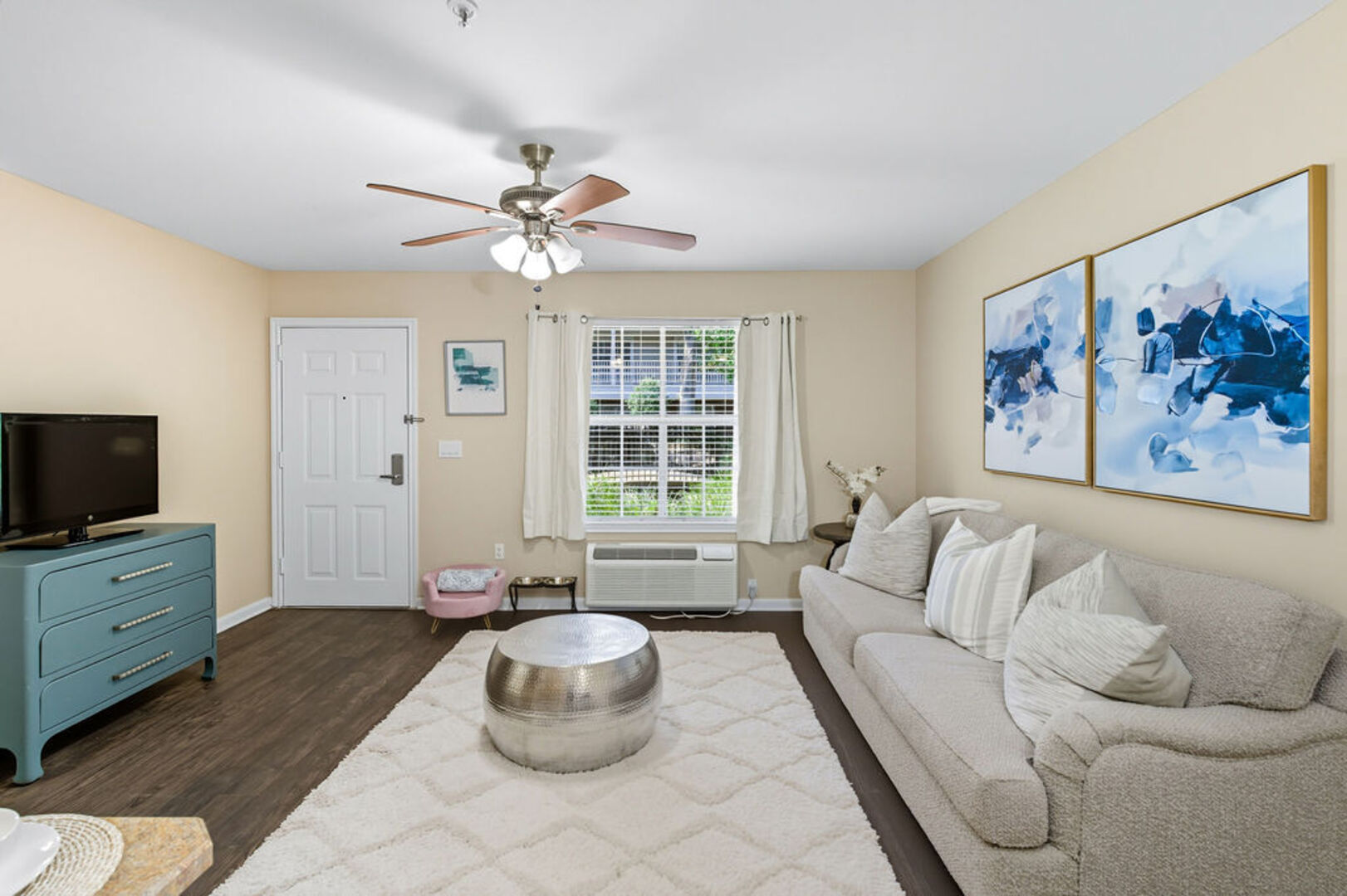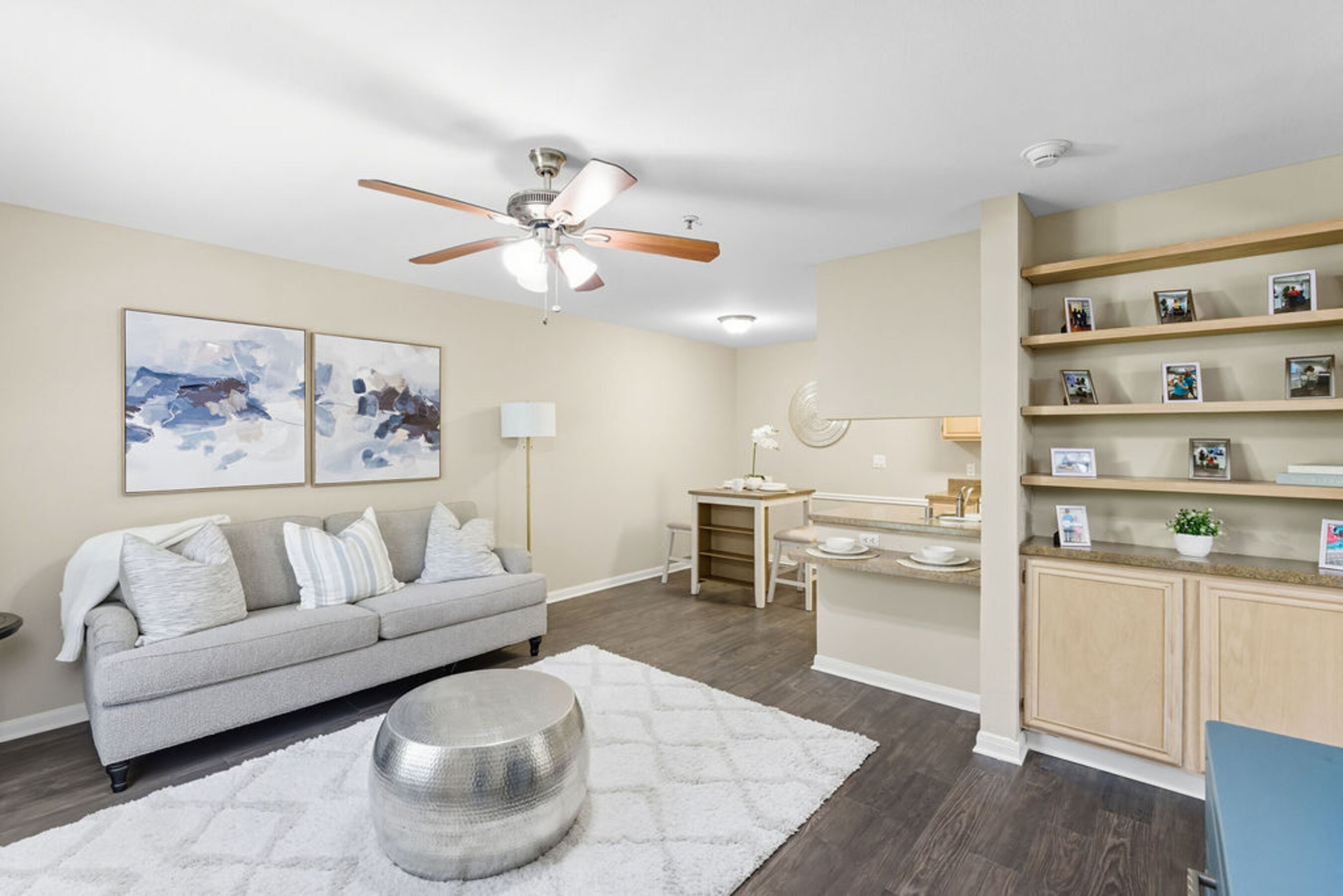 Our apartments for active adults 55+ offer expansive layouts with convenient features in every room. Fully equipped kitchens open to generously sized living and dining areas filled with natural light. Beyond the common area, large bedrooms provide plenty of storage space while deluxe bathrooms allow you to move around with ease. Select floor plans may also include a private outdoor space, such as a patio or balcony.